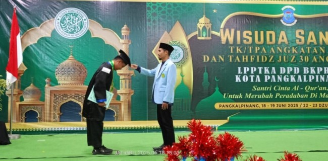 Beritalain.id - PANGKALPINANG. DPD BKPRMI Kota Pangakpinang menggelar prosesi Wisuda Santri TK/TPA Angkatan XXV dan Tahfidz Juz 30 Angkatan I LPPTKA di Bangka City Hotel, Rabu,(18/06/2025).