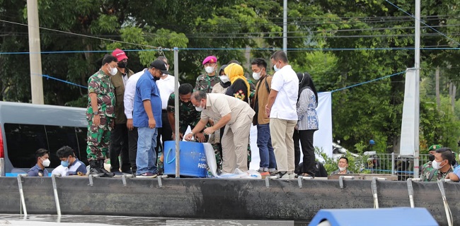 Beritalain.id --- SITUBONDO. Gubernur Kepulauan Bangka Belitung (Babel) Erzaldi Rosman, mengikuti panen perdana budidaya udang vaname dengan sistem mesin oxibam (ultra fine bubble) size 20 ekor per kilo, di Balai Perikanan Budidaya Air Payau (BPBAP) Situbondo, Jawa Timur.