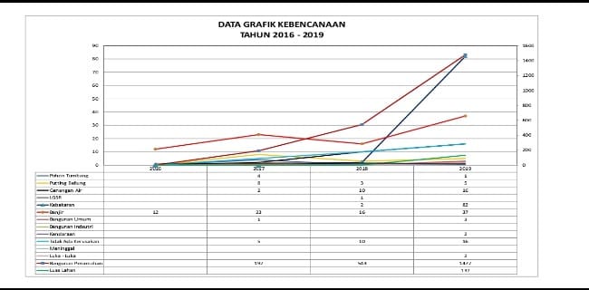 Kenaikan tersebut dilihat dari 3 tahun kejadian kebencanaan sejak tahun 2016 hingga tahun 2019 ini, dimana kenaikan eskalasi kebencanaan tersebut banyak terjadi pada bencana banjir serta kebakaran hutan dan lahan, angin kencang/puting beliung.