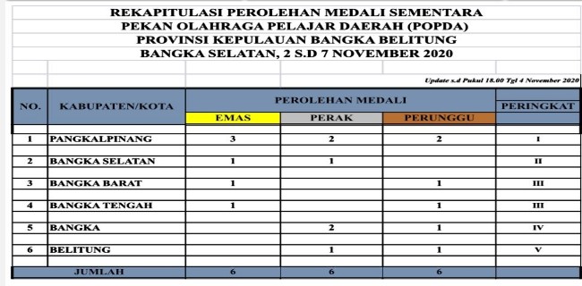BERITALAIN.ID, Berita Terkini Bangka Selatan - Hari ke-2 pelaksanaan Pekan Olahraga Pelajar Daerah (Popda) tingkat provinsi di Bangka Selatan (Basel), kontingen Kota Pangkalpinang kokoh di puncak pimpinan perolehan mendali sementara.