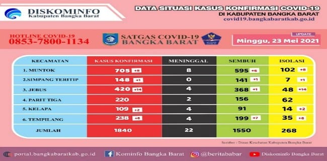 BERITALAIN.ID --- PANGKALPINANG. Kasus terkonfirmasi Covid-19 di Kabupaten Bangka Barat bertambah 31 kasus hingga 23 Mei 2021.