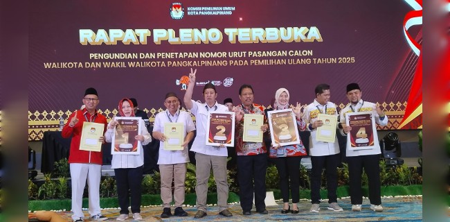 Beritalain.id - PANGKALPINANG. Komisi Pemilihan Umum (KPU) Kota Pangkalpinang resmi menetapkan nomor urut pasangan calon Wali Kota dan Wakil Wali Kota Pangkalpinang dalam Pilkada Ulang 2025. Penetapan dilakukan dalam rapat pleno terbuka yang digelar di Hotel Aston, Rabu (23/7/2025).