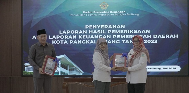 Penyerahan laporan hasil pemeriksaan atas laporan keuangan pemerintah daerah kota Pangkalpinang tahun 2023 dilaksanakan di Auditorium kantor BPK perwakilan Provinsi Bangka Belitung, Rabu (29/05/2024).