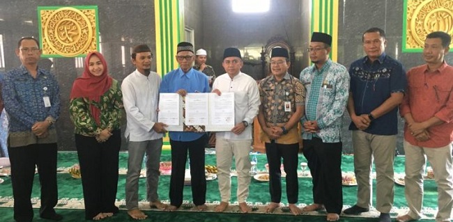 Beritalain.id --- PANGKALPINANG. Wali Kota Pangkalpinang, Maulan Aklil melakukan penandatanganan Naskah Perjanjian Hibah Daerah (NPHD) dan berita acara Serah Terima Barang Milik Daerah antara Pemerintah Kota Pangkalpinang dengan Yayasan Masjid Nurul Iman Lembawai Kecamatan Gabek Kota Pangkalpinang di Masjid Nurul Iman, Kamis (14/09/2023).