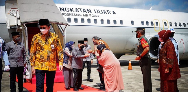 Menggunakan Pesawat Kepresidenan, Boeing 737-400 TNI AU, pukul 11.30 WIB disambut oleh Penjabat (Pj) Gubernur Kepulauan Bangka Belitung Ridwan Djamaluddin beserta istri, Sri Utami Soedarsono Ridwan Djamaluddin.